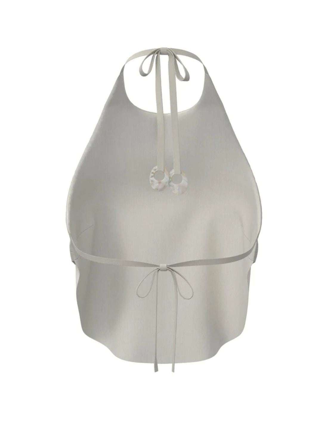 Top corto hecho 100% de lino en color natural y accesorios en nácar. El top presenta un cuello redondo y tirantes delicados adornados con hermosos aros de Madre Perla. Su bajo está decorado con sutiles y elegantes ondas.